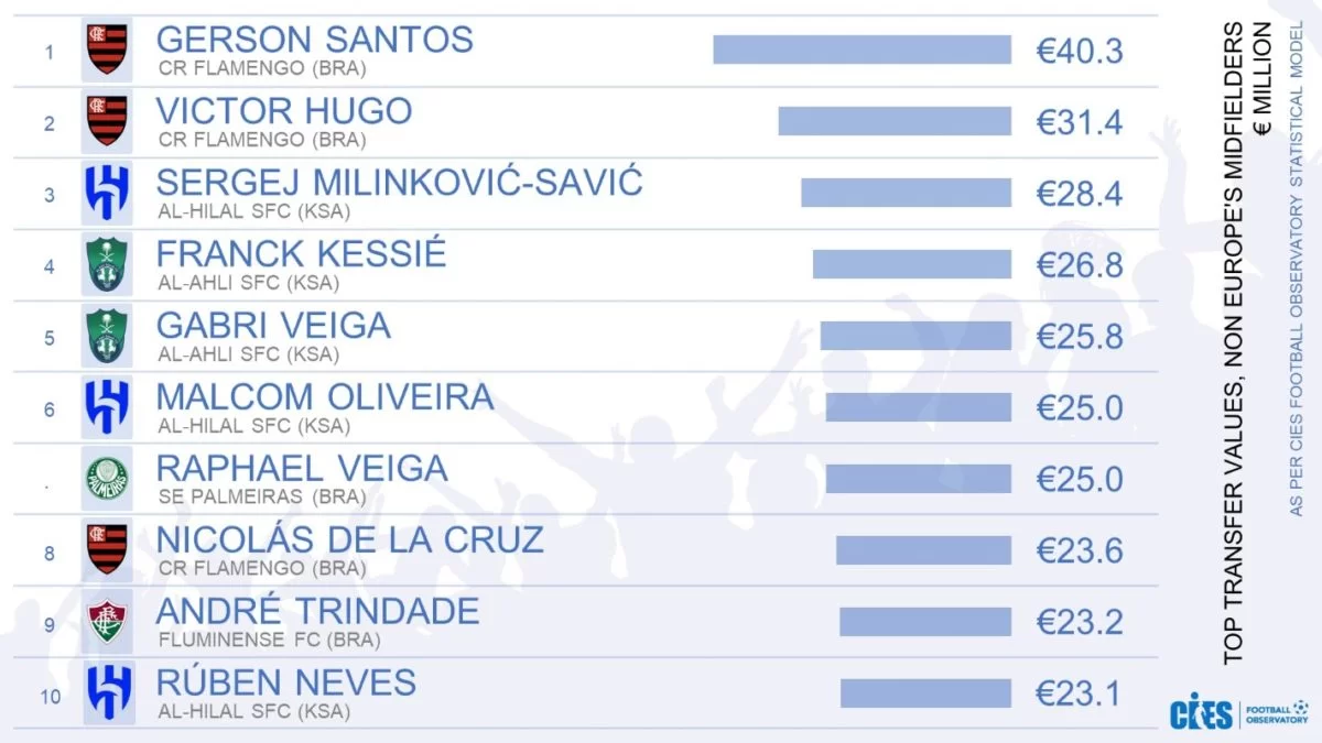 O Flamengo sempre é um dos times com maior influência no futebol brasileiro e essa importância acaba se transmitindo para o resto do mundo também, com muitas competições ganhas internacionalmente ao longo dos anos. Assim, não é chocante descobrir que o meio campista mais valioso, fora do circuito europeu de futebol, é rubro-negro. Esse é Gerson.