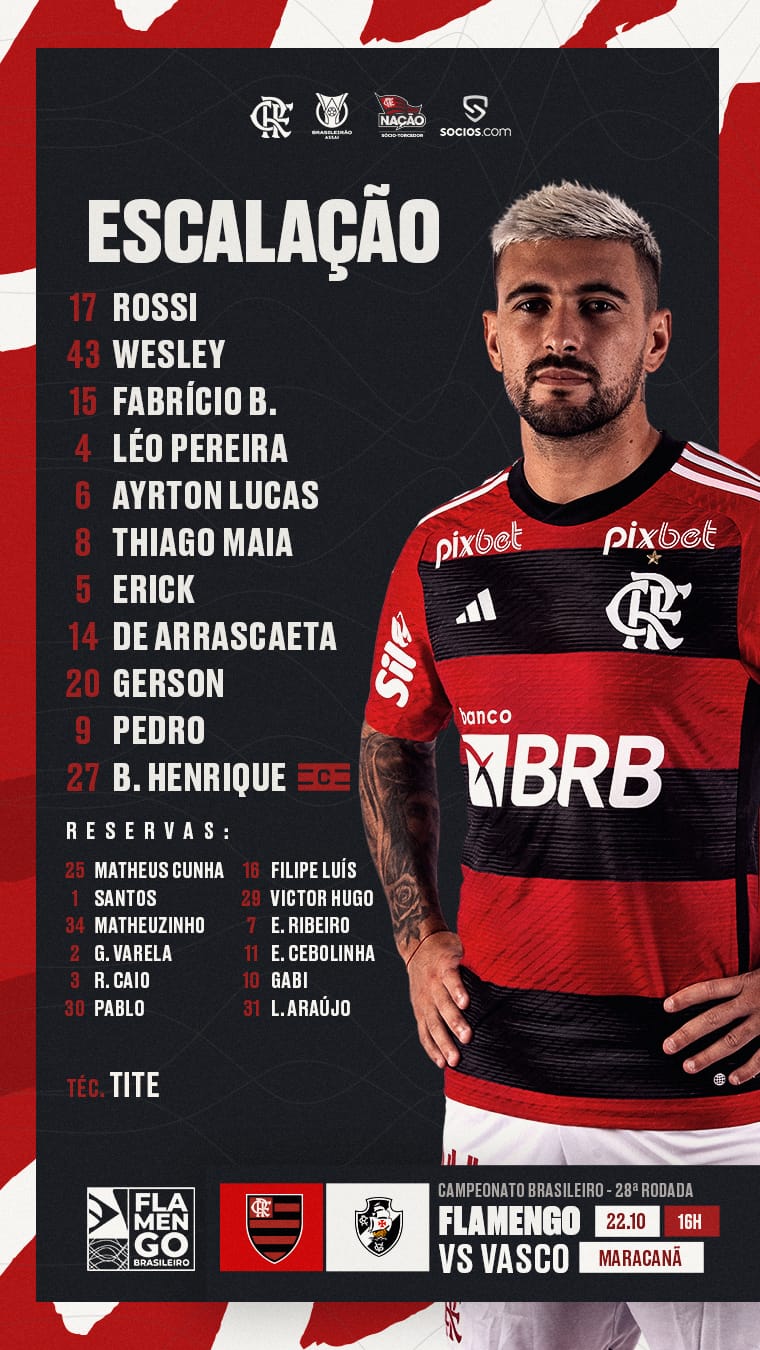 Confira a escalação do Flamengo, divulgada pela conta oficial do clube, nas redes sociais: